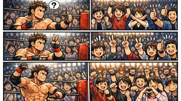 プロレスにおいて、試合中のプロレスラーと観客はもちろん対話はできません。プロレスラーが発信する言葉や行動を観客側が理解して称賛や非難などの感情を生み出すのものです。